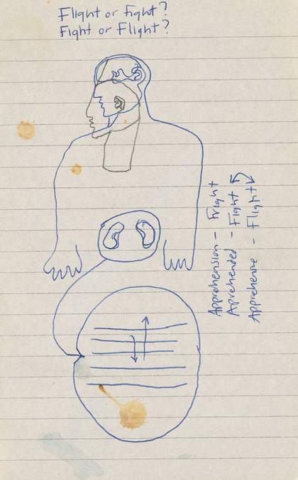 A page from one of Hamad Butt’s notebooks in Tate Archive, featuring a sketch of the sympathetic nervous system and notes reading: ‘Flight or Fight? / Fight or Flight? / Apprehension – Fright / Apprehended – Fight / Apprehensive – Flight’