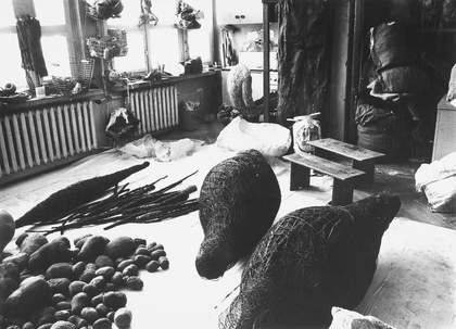Artists working in Poland at the time were granted recognition and economic support in the form of stipends, awards and studios through the Artists’ Union. These monumental forms were made in one of those state-sponsored studios, where Abakanowicz lived and worked between 1965 and 1989. She described her first flat in a letter to art historian Michael Brenson from 1994: ‘I have spent most of my existence on the 10th floor of an apartment building together with my husband, in a tiny studio flat as the surface was limited to 9m2 per person ... We all lived in the same way amongst our neighbours – workers, writers, taxi drivers, musicians, doctors, all squashed in tiny cells.’ Creating works that she was able to fold and store was an ingenious way of not compromising her vision while working in limited space.
