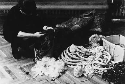 Threads are everywhere – it is through these threads that the world conjured up by Abakanowicz in her many installations seems to be held together. The exhibition space doubles as an arena for an unspecified ritual by offering shelter and rescue from external pressures. The vulnerability of the woven constructions introduces an element of threat: pull or cut the wrong thread and the whole fabric could collapse, both metaphorically and literally. From the early 1970s onwards, Abakanowicz treated every solo exhibition as a unique work in progress. In the many films documenting this process, viewers see the artist thinking on her feet, rearranging the woven forms, lifting and suspending the heavy structures, detangling and caressing the fibres, and carrying out the final adjustments with needle and thread in hand.