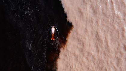 In Æqualia 2023, the artist swims through the Encontro das Águas (the Meeting of the Waters) in Brazil – the confluence of the Rio Solimões and Rio Negro, which forms the beginnings of the Amazon. One river, originating from the high mountain slopes and suspended with silt and clay, is churned to a milky white. It rubs up almost impossibly against the slower, black flow of the Rio Negro, which has wound its way through the forested lowlands and is thick with decayed plant matter. Viewed from above, Škarnulytė’s shimmering body traces the definite line between the two, sometimes almost lost from view in the chalky stream, sometimes starkly visible against the darker waters. The mermaid acts as a go-between for these two powerful bodies of water, while also being irresistibly borne along by their turbulent interplay. She becomes a link back to that cross-species, ancestral aquatic heritage, a glimpse into deep time.