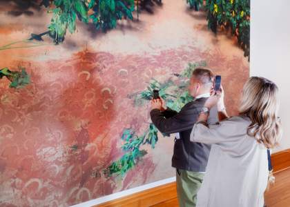 In another work, Hiroshima Mon Amour 2024, Sami constructs a watery scene, with what looks like clothes floating below the surface. This work references the 1959 film of the same name set in Hiroshima, Japan, 14 years after the US detonated its atomic bomb. Again, Sami finds evocative ways to grapple with global tragedies. His paintings force viewers to engage critically to construct narratives that rely on subtext. It is what cannot be seen that haunts these paintings, so that they stay with you long after you leave the room.