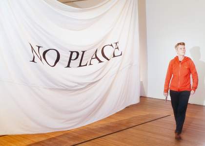 This particular flag quotes Joe Biden and Barack Obama’s words in response to the attempted assassination of Donald Trump in July 2024, underscoring their hypocrisy given their complicity in Israel’s war on Gaza. The flag, in one sense, is a visual symbol of the contradictions of people in power. However, it could also be read as the inverse of what the St George flag or any national flag represents. ‘No place’ pledges no allegiance or loyalty to a particular state, which makes even more sense when you consider that Matić photographs the people they relate to in terms of race, class, age, gender and sexuality – rather than geography.