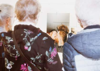 That said, Matić’s interest in Britishness is explicit: a fascination with ideas of belonging and symbols of pride is omnipresent throughout their work Feelings Wheel 2022–25, which spirals around the edge of the gallery. Photographs of varying size overlap one another and lean in acrylic frames against the wall. Here are pictures of flags, parties, pro-Palestine protests, lovers kissing, shop fronts and queer communities. The series of intimate and tender images provides a window into British life, with all its cracks and complexities, against a backdrop of rising far-right support in the UK. Matić’s diaristic images show how identity can form outside of rigid ideologies. Through making private worlds public alongside nationalist iconology, the artist leans into the feminist idea that the personal is political.