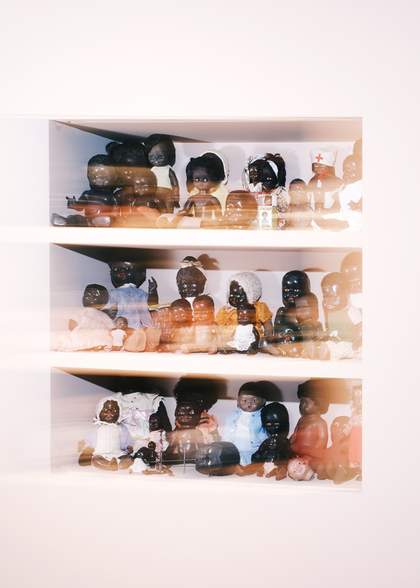 The work Restoration 2022–25 showcases a collection of broken and discarded antique Black dolls. They sit on shelves – some without clothes, some dressed – longing to be held. In the 1960s, after the Watts Uprising in Los Angeles (motivated by calls to end police brutality), companies began to mass produce ‘ethnically correct’ dolls to offer Black children toys that better reflected them. Matić began collecting these dolls while reflecting on their father’s fraught early years, after he was abandoned as a child in Peterborough. The inclusion of these dolls seems to represent an opportunity to extend love and care to Matić’s father while also engaging with a period of deep societal and racial unrest that doesn’t feel all that dissimilar to now.