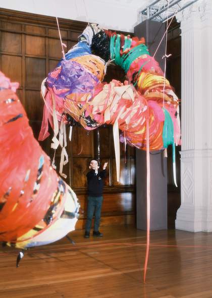 Encountering Kalu’s work for the first time is to be bombarded with colour and energy. Her display at Cartwright Hall is a parade of her expressive winding sculptures and drawings. Suspended from the ceilings are Kalu’s cocoon-like formations. She creates them by wrapping fabric, rope, and VHS tape around a structural base, resulting in vivid knotted forms that are both unpredictable and theatrical. There is a symbiotic relationship between the sculptures and the artist’s body – a dance that allows these works to feel like living, breathing things.