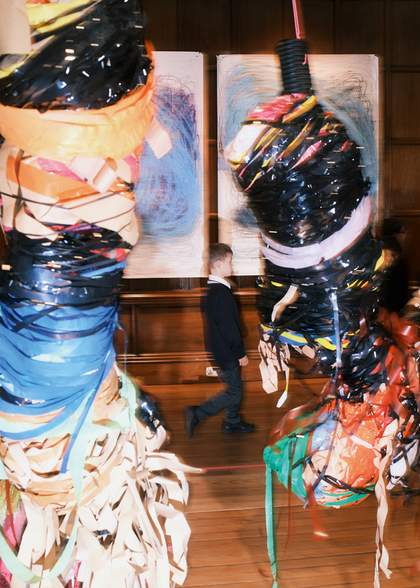 Learning that Kalu makes much of her work while listening to disco, ABBA, Stevie Wonder and Michael Jackson makes absolute sense. There is a physicality to her work – a bodiliness and rhythm apparent even at first glance. With all the layering of colours and textures, there is something freeing in the excess and overspill of materials, an overwhelming sense of joy. Kalu’s structures loom large at different heights in the centre of the space and are more than beautiful shapes – they are structures made with feeling and craft in mind. Kalu’s work is like a tribute to process and material, gesture and echo. The act of making the art seems to be as important as the art itself. Flexibility, improvisation and exertion are integral to the work’s concepts. Technique is the idea.