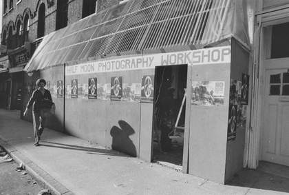 Posters featuring Peter Kennard’s artworks Haywain with Cruise Missiles and Protest and Survive both 1980 pasted on the exhibition frontage at Half Moon Photography Workshop, East London, 1980