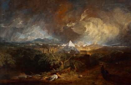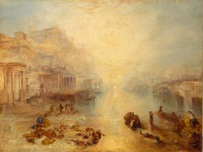 The sunlit land glimpsed beyond the blizzard in Hannibal and his Army Crossing the Alps is made to suggest all of Italy. It was almost another decade before Turner reached that land himself, though the ‘world of his own mind’ was already blazing with the imagined southern sun. Reprising Claude, he painted head on into the light. Repeatedly, always with new urgency, Turner recreated Claude’s ‘seaport’ compositions, in which we look out from a harbour, straight towards the sun. Such views could tell the beginning and end of empires. In Dido Building Carthage 1815, a civilisation readies itself at dawn. Boys on the harbourside push toy boats out into the water. In the pair or sequel to this monumental canvas, The Decline of the Carthaginian Empire 1817, a setting sun casts an effulgent, elegiac light on the terraces of a city and an empire nearing its end. The children and young men, now surrendered to the enemy, bid their mothers farewell. When Turner went on to paint Rome as a sunlit port, he summoned by allusion the memory of this fallen Carthage.