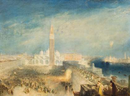 He had learnt the city picture by picture from Canaletto, and made his own bright ‘Canaletti’ versions of the waterfronts from low viewpoints that rendered all solid and stably balanced. Canaletto’s views of San Marco had laid out, with vivid clarity, the detail of each colonnade and market stall. Turner made his answer: from a great height, unearthed, we see the Piazza lose its geometry. Crowds move in a river, coalescing around a fire that seems to melt the buildings to rippling, luminous liquid. Most of all, the city is the night air, the iridescent dust of fireworks, the deepening colours of the sky.