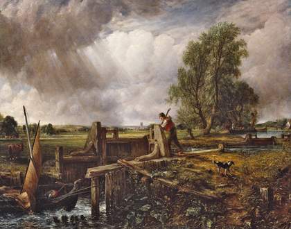 'Bring me my umbrella! I’m going to look at Mr Constable’s picture.’ This sally by John Constable’s fellow artist Henry Fuseli is recorded in various forms – sometimes it is his umbrella he calls for, sometimes his greatcoat – strongly suggesting he used the line more than once. Like the best standing jokes, it contained a large measure of truth: by the 1820s, Constable was well known for making the weather feel vividly present in his paintings. In 1825 a Hampstead neighbour, the actor Jack Bannister, was keen to buy a picture and described what he wanted not in terms of subject but of effect. ‘He has long desired one of me’, Constable relayed to a friend, ‘in which, he says, he can feel the wind blowing on his face.’ A Boat Passing a Lock 1826 is just this kind of picture. Manoeuvrings of lock mechanism and barge are put in their prosaic place by the cosmic spectacle of sun rays battling against cascading, bruise-grey clouds: it is an opera pitched against a folk song.