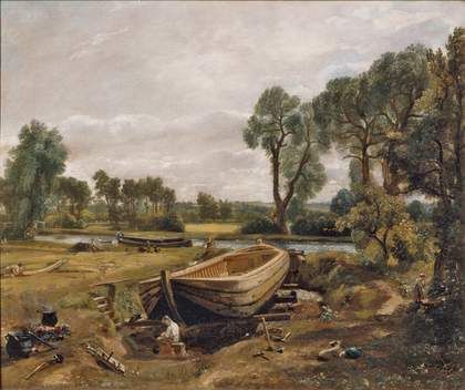 Like that of every other professional artist of his day, Constable’s working year was dominated by the Royal Academy exhibition, and the fixed point of its annual opening on the first Monday in May. Until he was 40, when he married, he would typically spend the summer and early autumn at his family home in East Bergholt, returning to London in October or early November with brimming portfolios and sketchbooks stowed in his luggage. This was the beginning of what he called his ‘winter’s campaign’ at the easel, when he worked on the pictures that had to be ready to submit to the Academy in the spring. Trying to evoke the feeling of a summer’s day in the wintry light of his painting room was not easy; in the earliest weeks of 1801, his second London winter, he complained to a friend back in East Bergholt: ‘I paint by all the daylight we have, and that is little enough ... I sometimes however see the sky, but imagine to yourself how a purl must look through a burnt glass.’ Years later, in 1814, he was still struggling to bring warmth to a painting of a green valley, based on a pencil sketch he had made the previous July: ‘it is bleak and looks as if there would be a shower of sleet’, he moaned. So, later that year he began an experiment: rather than making sketches outdoors then retreating into his painting room to work on the composition itself, when working on Boat-Building near Flatford Mill 1815 he took easel, canvas and sketching stool down the lane to Flatford, where his father had a dry dock, and sat down to paint in the open air. As the sunlight reflected on the leaves of a willow stirring in the breeze, and flickered on the ripples on the river’s surface, he recorded all the fresh vitality sparkling in front of him with dabs of pale paint against his subtle shades of green. He was catching nature on the move: not as it looked through the conventional artistic filters of his time, but as it struck his eye.