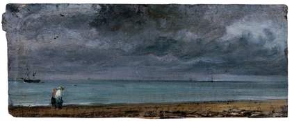 Brighton, with its blustery microclimate, could put on an even more dramatic show. The family often stayed there for the sake of Maria’s health, but Constable was exasperated by the town’s frivolity, calling it ‘the receptacle of fashion and offscouring of London’. And yet he soon grew to relish its dramatic storms and turbulent seas: he was one of the few visitors who did not welcome a cloudless sky. Among the very first oil sketches he made in Brighton is one that shows two women battling their way along the shingle, bent over as they brace themselves against the gale under clouds almost purple with an imminent squall. ‘June 12 1824 / taking the air’ was the comment he wrote on the back: you can almost hear his wry chuckle. Another day, seeing the sky turn the shimmering greys and pinks of trout skin, he raced to record a summer storm with his brush, poised to dash for shelter as he hastily dabbed in boiling black clouds and brilliant rays of light, using the bristle-tracks of his brush to evoke torrents of rain lashing down on the sea.
