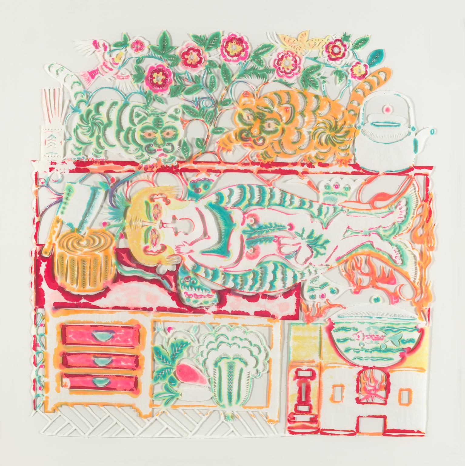 Lawson finds her subjects through chance encounters or friends, gravitating towards those who resemble people she grew up around. She then works closely with her models to decide on details of the composition, such as the environment and their pose. The artist carefully stages each scene, sometimes inserting props or rearranging furniture. The distinction between invented and authentic aspects is deliberately blurred.