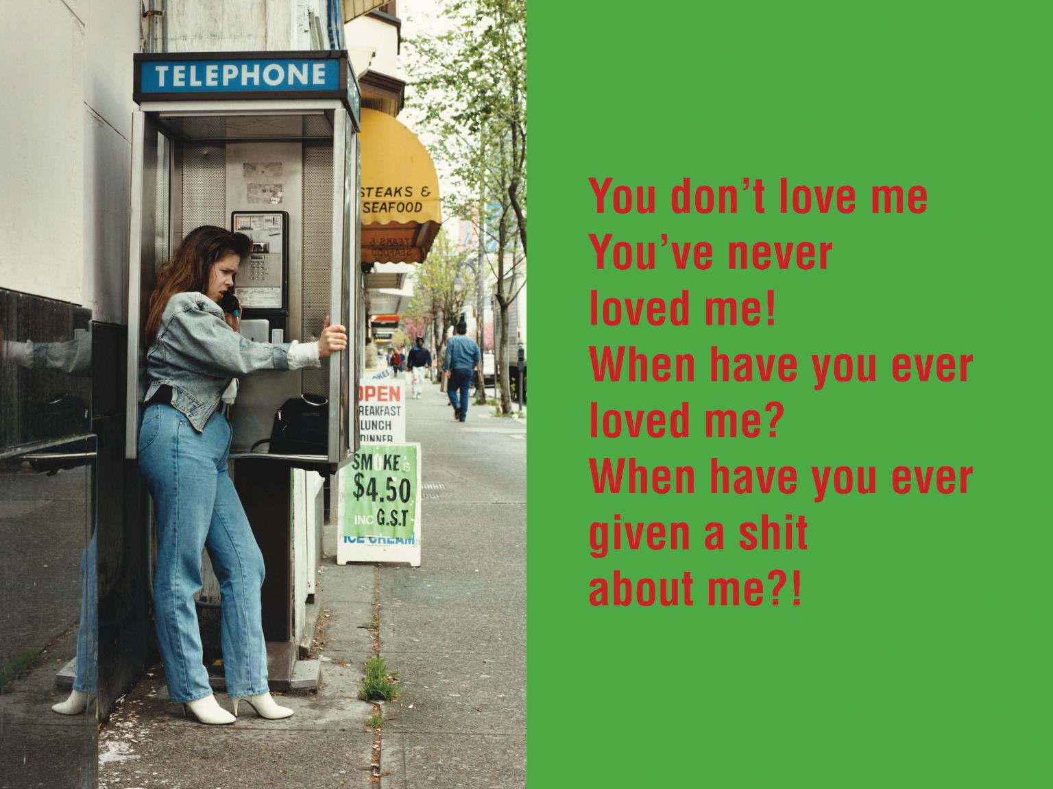 Ken Lum’s work You Don’t Love Me 1994 gives the title to this display, emphasising the manipulative nature of advertising techniques so prevalent in visual culture. In this work, Lum combines photography with text, often depicting characters grappling with societal pressures, as he observed in 1990s Vancouver.