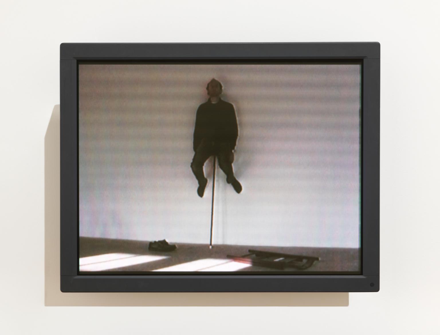 This video with sound is shown on a monitor and lasts nearly forty-eight minutes. It is one of a large number of works, mainly photographs, in Tate’s collection that form part of Erwin Wurm’s series One Minute Sculptures (see Tate P14777–P14816 and Tate P82011–P82016). Wurm began his One Minute Sculptures in 1988, and has since been continuously contributing to the encyclopaedic series in myriad locations around the world. The individual photographs feature images of people – anonymous participants, performers, curators, artists and even the artist himself – engaging in unconventional and sometimes physically challenging interactions with everyday objects such as clothing, buckets, balls, doorframes, bicycles and perishable goods. The resulting compositions feature unusual contortions – held for a minute – and illogical still-lives that are both humorous and provocative. While the photograph is the enduring record of each composition, the work comprises the entirety of the performative process, which begins with Wurm delivering instructions, both written and pictorial, to the subject of the ‘sculpture’. The participant subsequently enacts the determined formation or action and maintains it for a period of sixty seconds, during which time the pose is photographed. In a complex work that explores interaction, activation and the temporal, Wurm employs the photographic medium as a means of cataloguing his ephemeral studies.