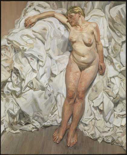 Sue Tilley, known as ‘Big Sue’, was a friend of Leigh Bowery’s and worked at his nightclub, Taboo. It was through Bowery that she was introduced to Freud, and she modelled for him on several occasions in the mid-1990s. Tilley was initially apprehensive about posing nude, saying that she ‘used to get a bit embarrassed’ and that ‘Leigh made me take my clothes off to practise’.
