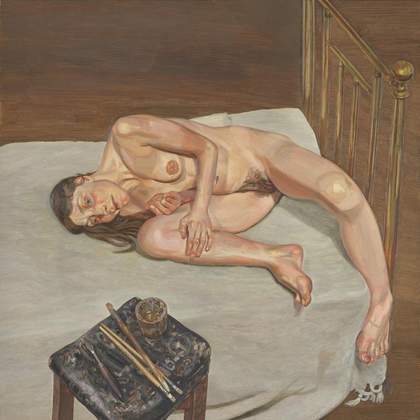 Freud often asked Paul to pose for him, and this provided mixed experiences. She was pregnant while modelling for Girl in a Striped Nightshirt 1983–5, and the painting became a favourite of Paul’s, as she found Freud particularly loving and attentive during this time. However, she was uncomfortable posing nude, saying that in one sitting Freud ‘stood very close to me and peered down at me. I was very conscious of my flesh, and I felt myself to be undesirable.’