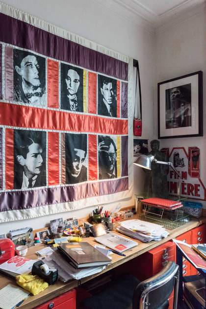 Ground floor study. Banner featuring King's favourite cultural figures including Vsevolod Meyerhold, Boris Pasternak and Dmitri Shostakovich (centre) and Muhammad Ali by King (far right)