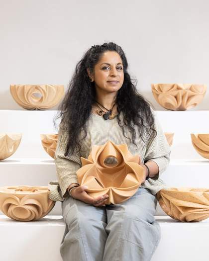 Halima Cassell creates geometric sculptures and ceramics sing a direct carving technique. Her work combines bold forms and patterns that play with light and shadow, drawing on geometry found in nature, her surroundings, and her heritage.